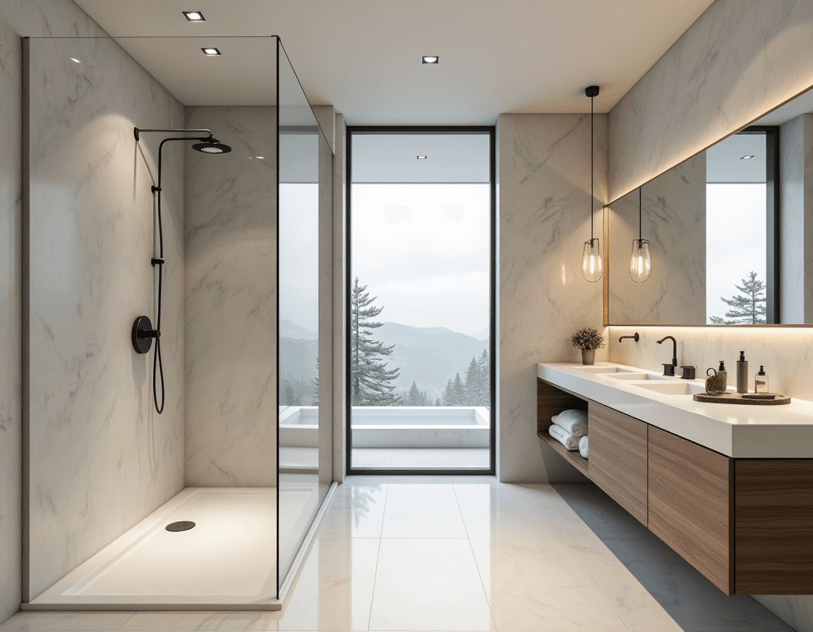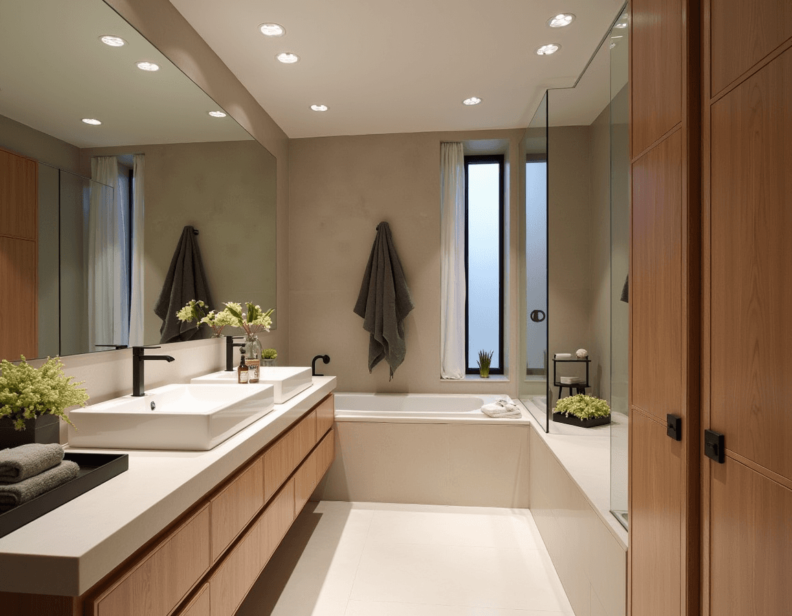 Wood accents are a smart way to introduce warmth without losing the crisp, modern vibe. Even a small detail, like a wood-framed bathroom mirror, bath caddy, or light fixture, can shift the tone of the bathroom.