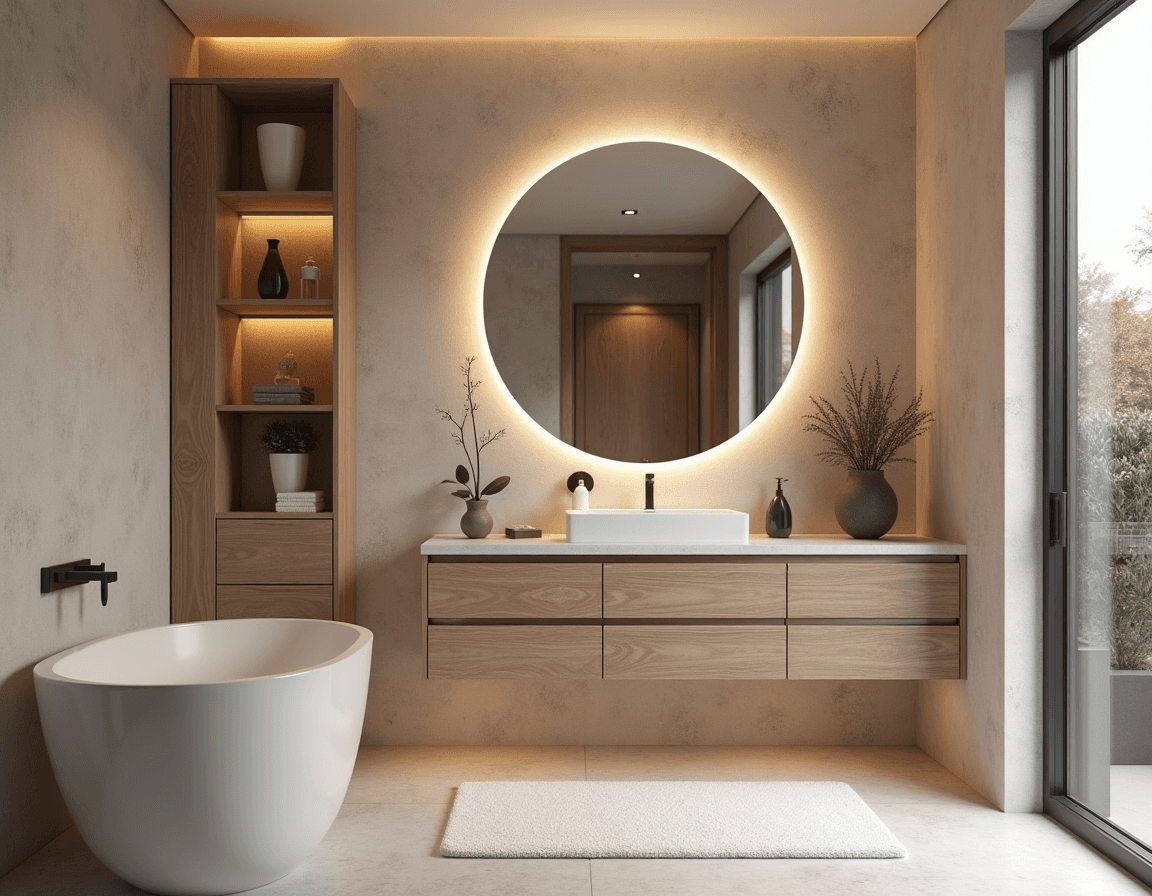 A bathroom should feel like a personal oasis: the kind of room that makes you want to light candles, fill the tub with bubbles, and forget your inbox exists. The right modern bathroom lighting perfects the spa retreat look. A round backlit mirror creates a cool aura, while downlights in the ceiling and under open shelves cast a golden hour glow. This simple change turns a plain bathroom into an indulgent escape.