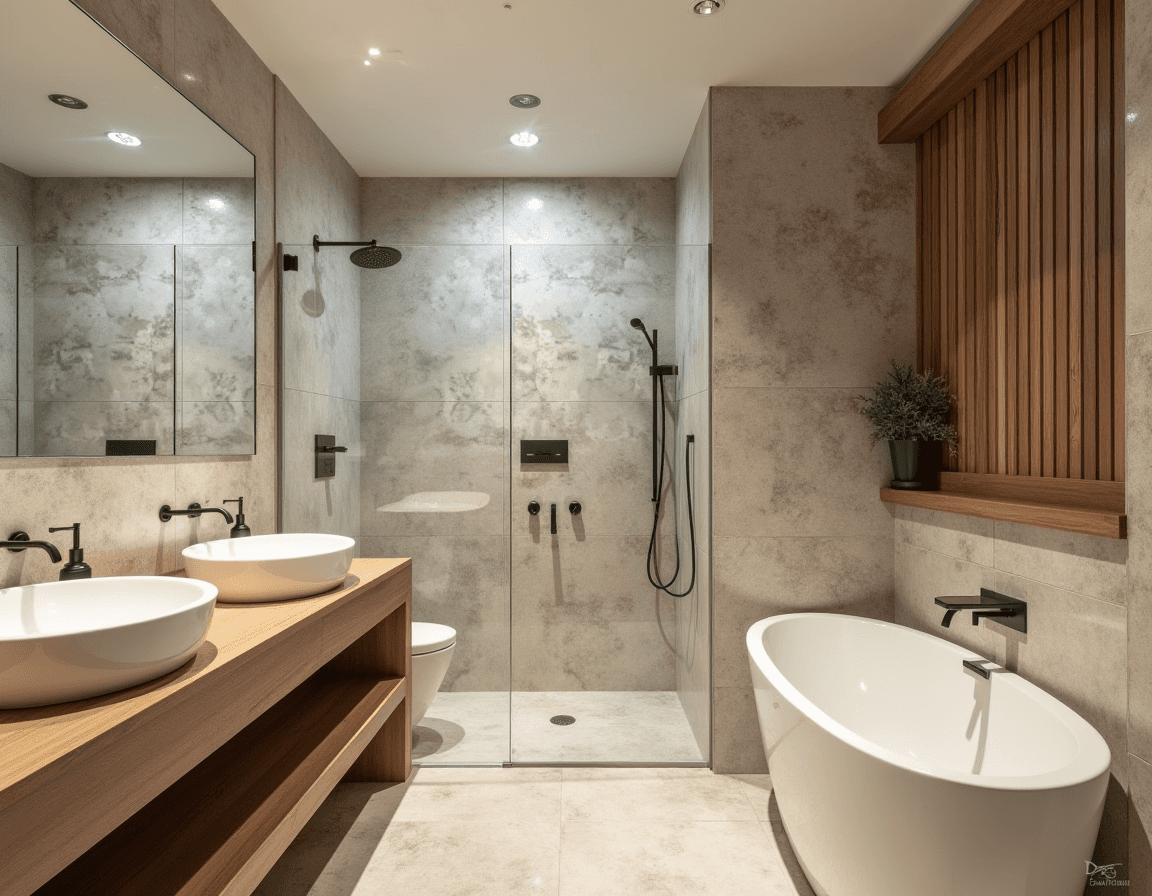 For a more layered, Japandi-inspired approach, you might pair a warm wood vanity and wall paneling with a white porcelain tub and sink — and perhaps natural stone across the walls and floor. The contrast in materials adds depth without visual clutter, creating a streamlined bathroom that still feels modern and inviting.