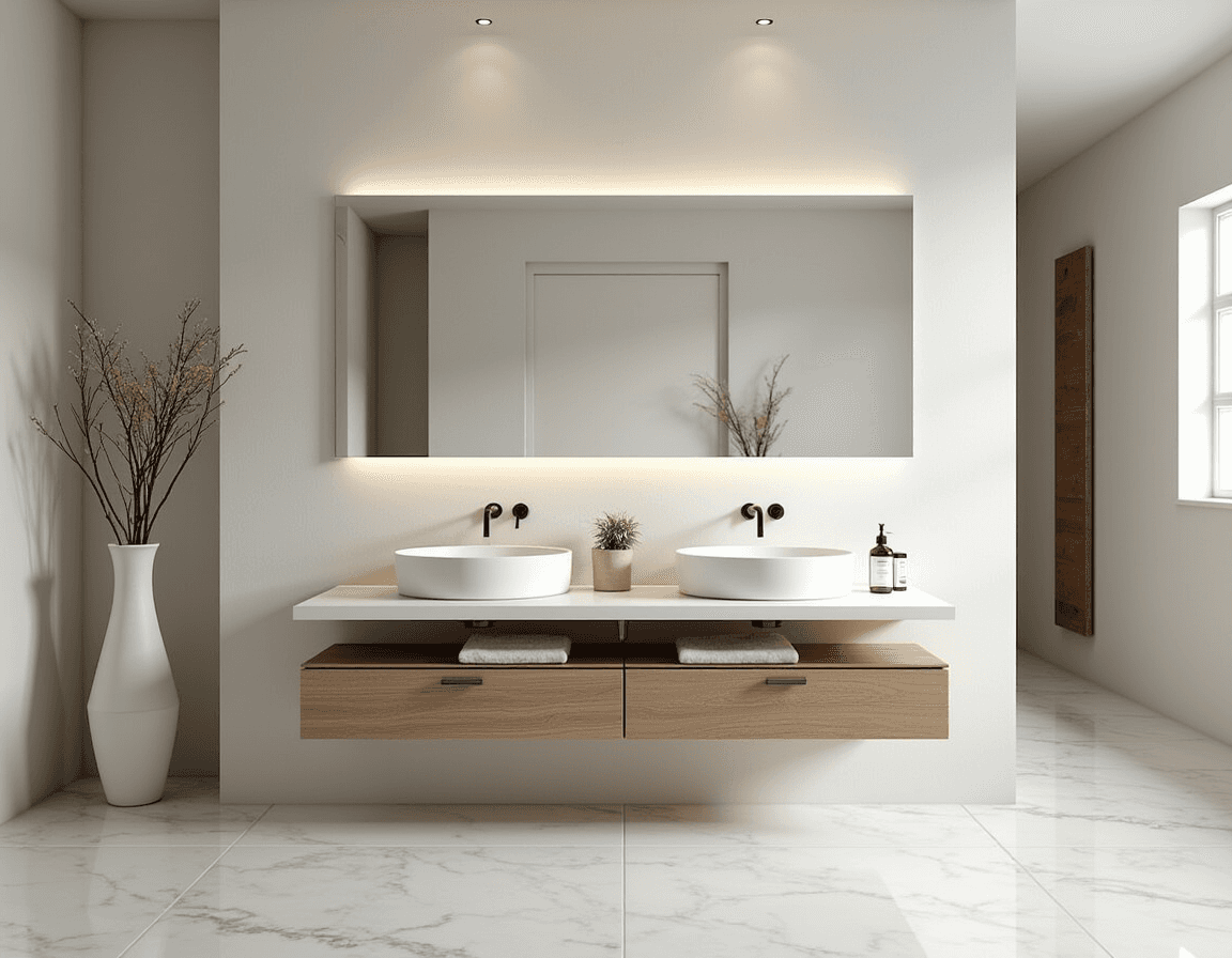 In a luxury modern bathroom, wall-mounted cabinets keep the layout minimalist and shift your attention to the materials: marble floor tiles, ceramic sinks, and a mirror that glows softly from behind.