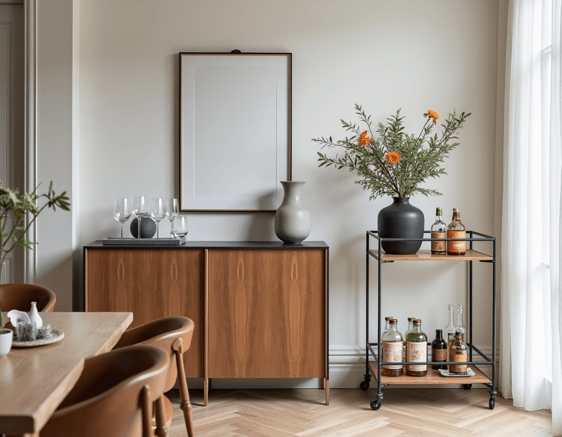 It’s not just the added functionality that makes a bar setup feel modern, it’s the materials and form. A clean-lined sideboard in grainy wood sets the tone, while matching details like a bar cart and classic round vase create a separate nook from the rest of the formal dining room. Displaying vintage coupes, sculptural decanters, and a shiny ice bucket leans into a more retro — but still modern — visual language.