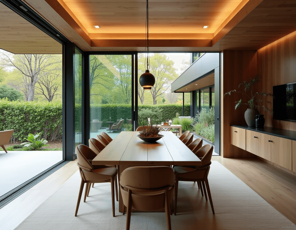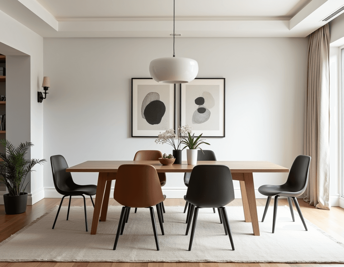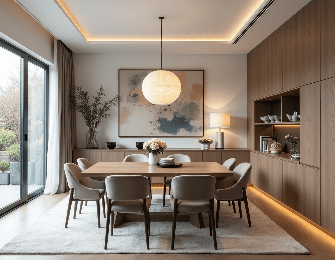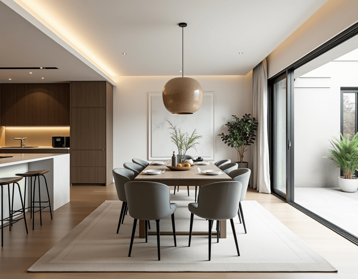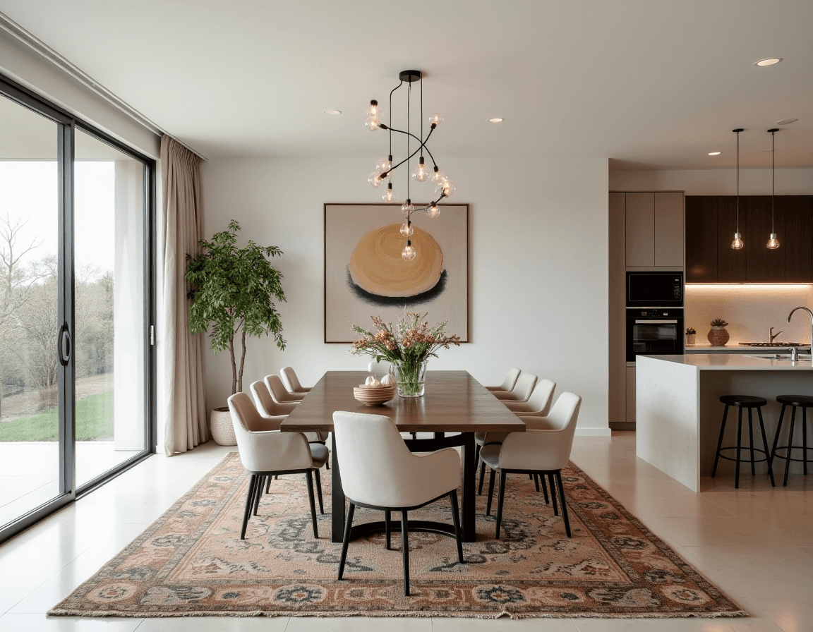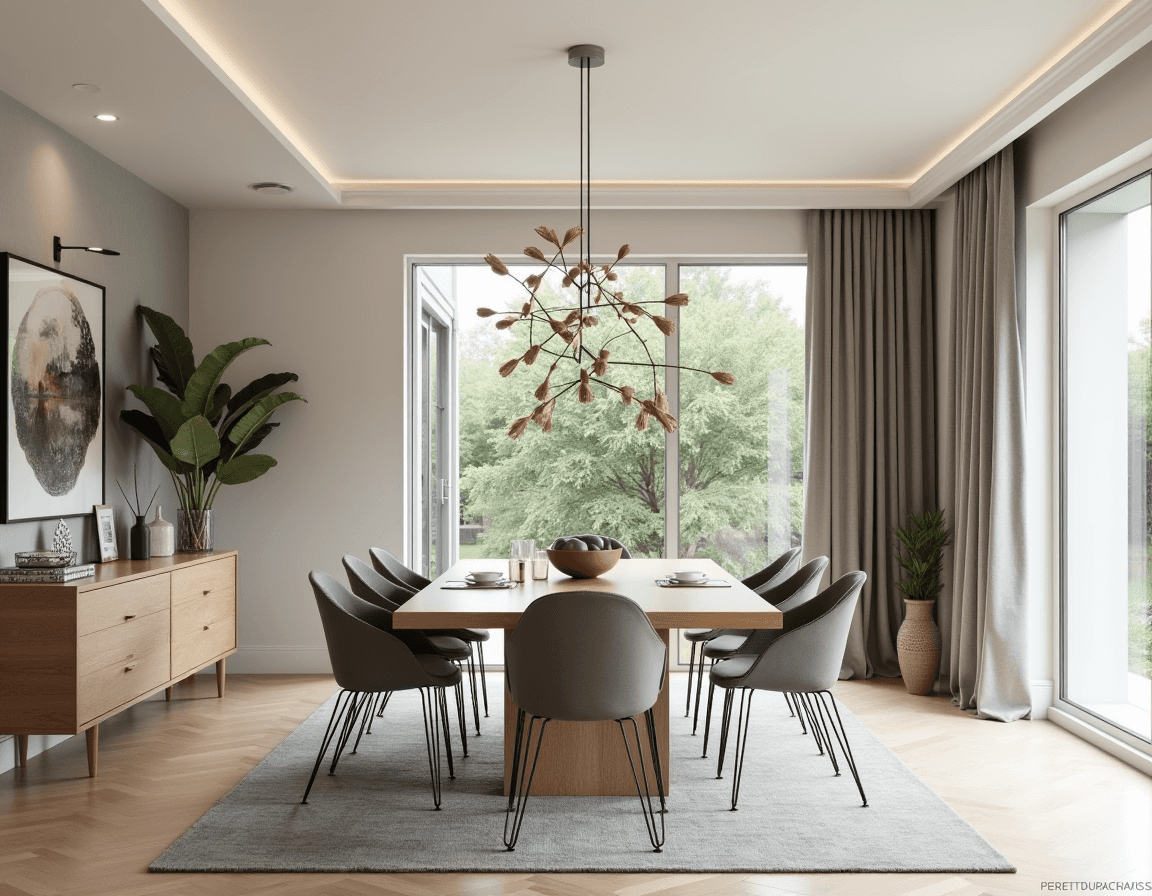 Neutral color palettes keep the space’s focus on shape, material, and light. You can choose a minimalist approach with a monochrome color scheme (white, beige, or grayscale) or mix neutral tones with accent and decor choices. Sticking with similarly shaped objects like rounded black ceramics, a half-dome pendant light, and tubular chair legs make the design feel purposeful, but a textured rug or subtly patterned curtains stop it from feeling too stark. The end result is elegant, luxurious modern dining room design.