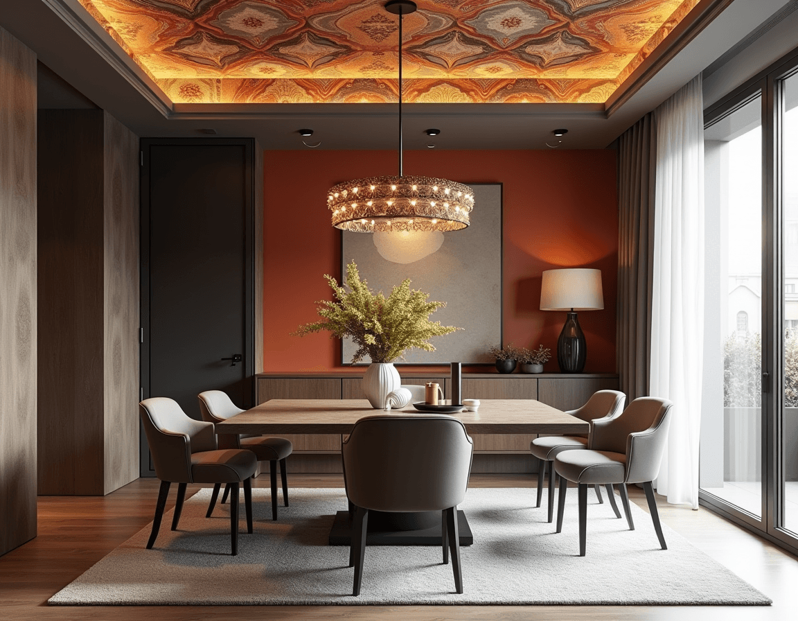 Wall and ceiling treatments are an underutilized way to have fun with your dining room decor ideas. Wallpaper — on an accent wall, above wainscoting, or all over — personalizes a modern design, seamlessly integrating unique patterns like vibrant Alhambra to channel modern Spanish style or swirling textures to add visual depth. For a less obvious but very impactful twist, try adding bold wallpaper to the ceiling. It’ll draw eyes upward, adding more emphasis to lighting fixtures and wall art.