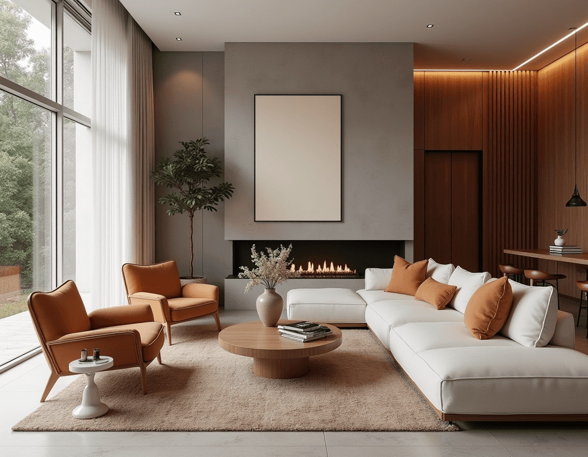 This living room keeps the palette tight and the lines clean, letting just a few smart material choices do the heavy lifting. A smooth white leather sofa and curved rust-colored chairs create a polished feel, while a soft boucle rug ups the luxe factor. Slight contrasts, like a leafy plant and flowing curtains, add a dash of free-flowing contrast without disrupting the minimalist style. The materials speak quietly, but they’re doing plenty to make a space exude both style and comfort.