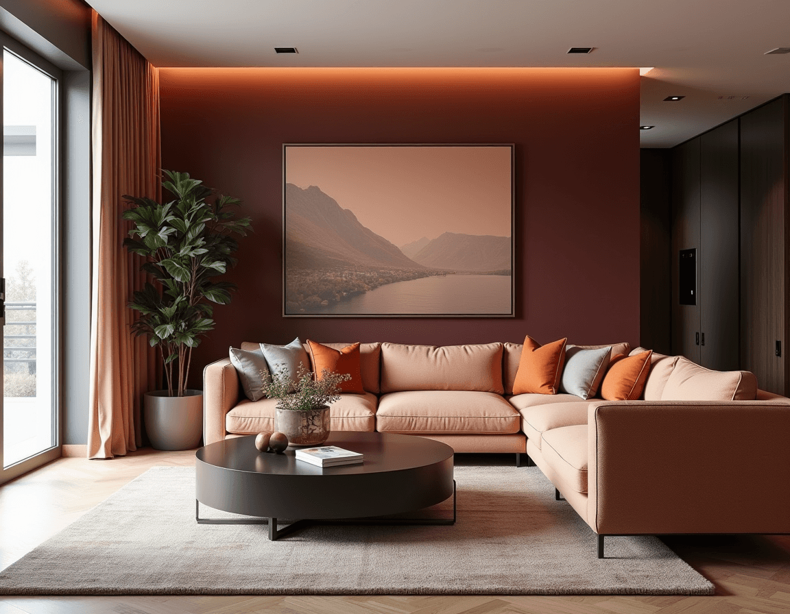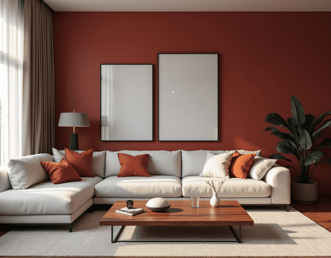 Red doesn’t exactly whisper — but with the right styling, it doesn’t have to scream, either. This bold accent wall brings just enough heat, offset by orange-toned throw pillows, a walnut coffee table, and rich wood flooring. A bone-white sofa, sheer drapes, and pale accent pieces keep the palette grounded and balanced.