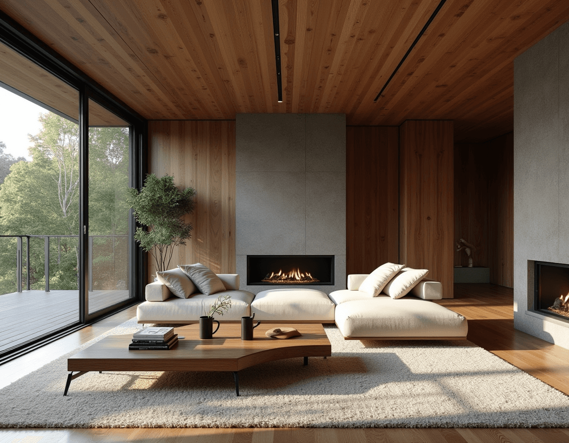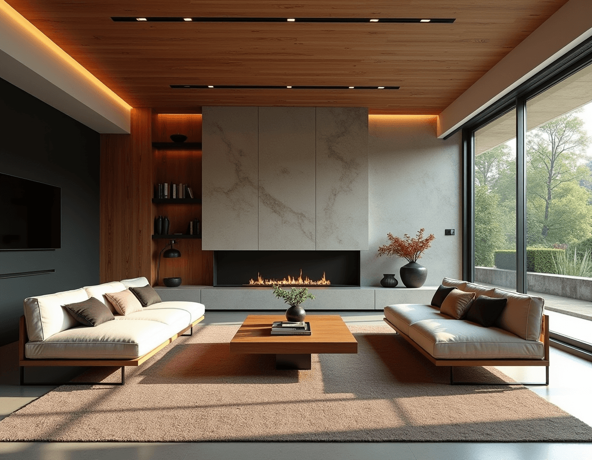 Here, two slim white sofas face each other, naturally showcasing the striking marble fireplace and glowing linear insert. Underfoot, a subtly textured rug and square wood coffee table frame the space and play with brown tones, guiding the eye upward to a beautiful wood-paneled ceiling. It’s quiet and clever, which is exactly the kind of balance that defines a well-designed contemporary living room.