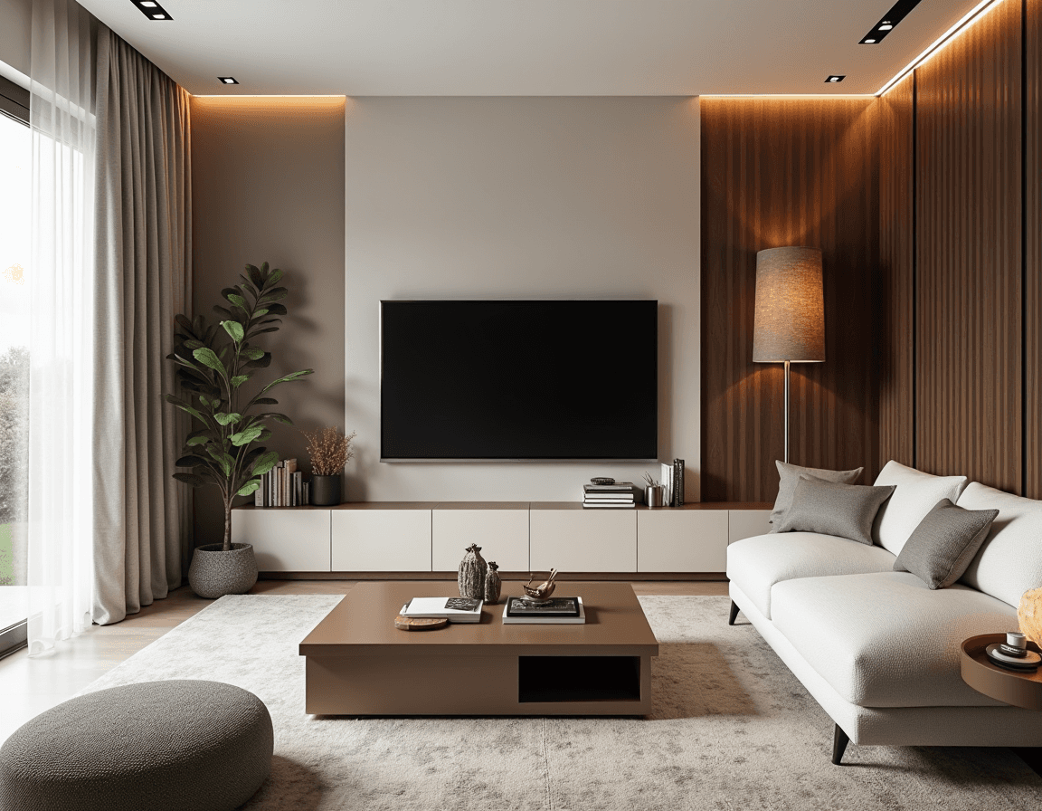 Modern living room design steers clear of high contrasts. Here, a layered neutral palette — soft whites, warm browns, and muted greys — creates a calm, cohesive feel with just enough tonal variety to keep things from falling flat.