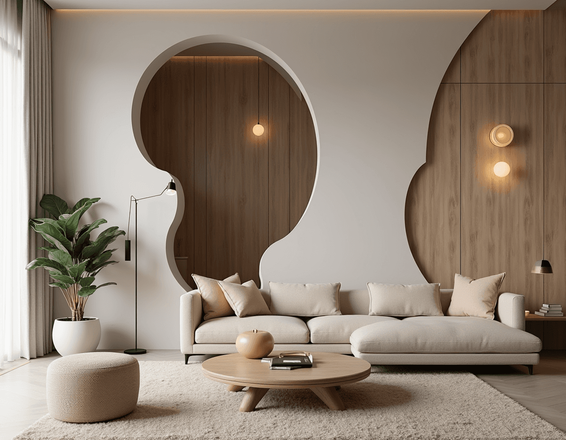 There’s nothing stiff about the furniture setup here. With a puffy, overstuffed sofa, a round pouf, and a curved coffee table, this living room leans into an airy feel without losing its design edge. On the wall, a sculptural curved panel makes a high-art statement, echoing the decor’s organic lines while adding a sense of gallery polish. It’s modern, stylish, and playful — and a great example of how trendy modern living room decor can be both elevated and free-flowing.