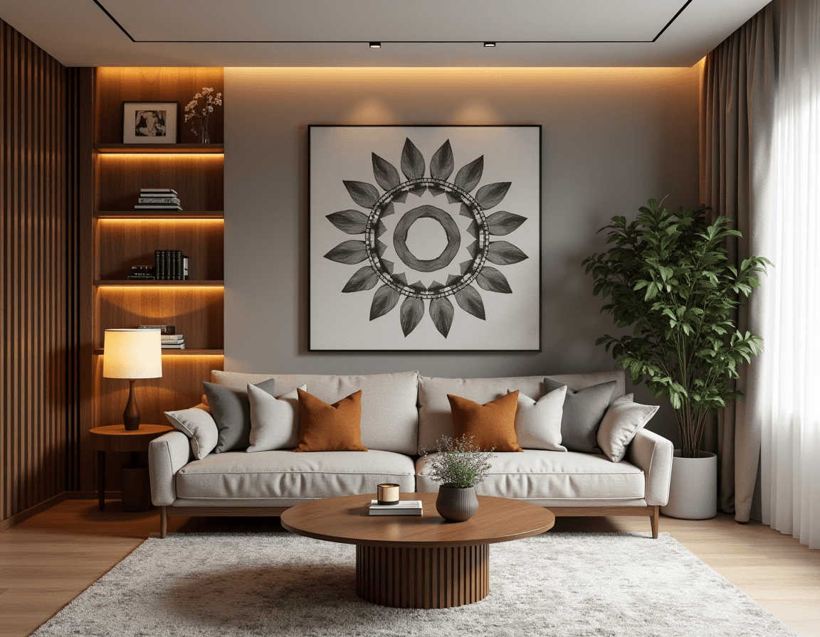 Modern living room design doesn’t overdo it on the artwork — no gallery wall sprawl or cluttered frames. One bold piece or a pair of graphic prints is enough to set the mood. Here, simple geometric shapes add a playful edge while echoing the orange and brown tones in the furniture. It’s curated, not chaotic — a modern family room idea with just the right contrast of fun and structure.