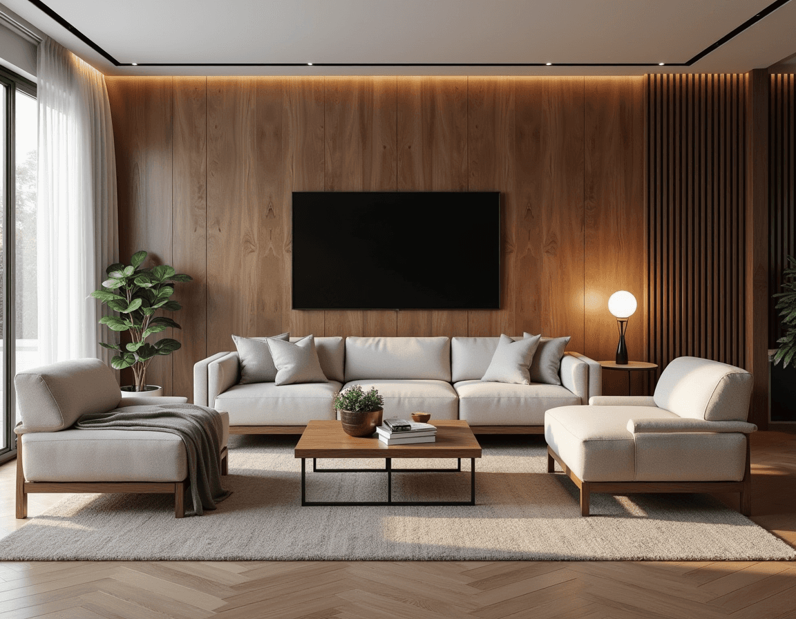 Modern design loves a material mix — not to show off but to keep you looking at the unassuming but effective interior design details. Here, warm wood takes the lead across the floorboards, wall paneling, and even the sofa and armchair legs. Quiet contrasts (slim metal legs on the coffee table and a stone planter) cool things down just enough. On the surface, the design palette is cohesive, but subtle modern decor ideas add depth.