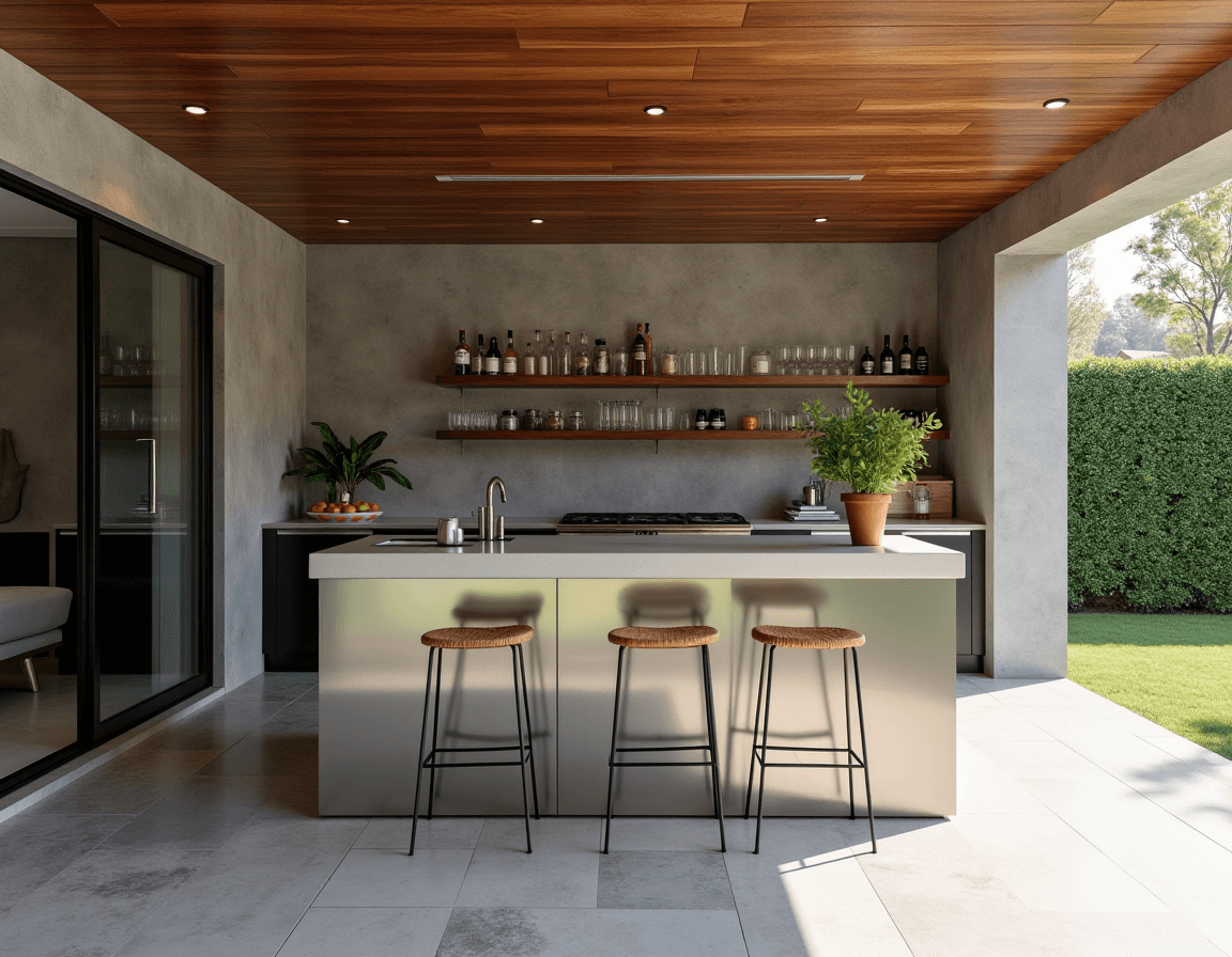 Stainless steel does what concrete can’t: It reflects light, adds luster, and gives an outdoor patio bar a distinctly high-end aesthetic. Here, the countertop sits against concrete walls and floor tiles, keeping the palette tight and contemporary. A wood-paneled roof and matching floating shelves warm things up just enough to keep the space from dipping too cold.