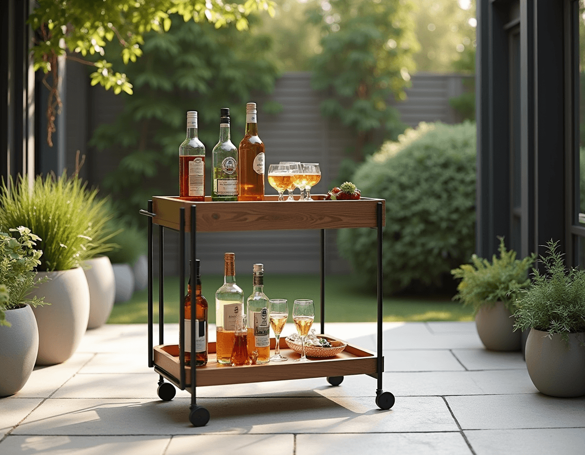 Not everyone needs a full, built-in patio bar. Sometimes, a modular bar car is the smarter patio bar idea. It’s perfect for small outdoor spaces or anyone who likes entertaining on special occasions. Modular bar carts can be wheeled out when guests come over, stocked with the essentials, and tucked away (or back in the kitchen) when the party’s over. Look for options with enough space for a few bottles, glassware, mixers, and an ice bucket.