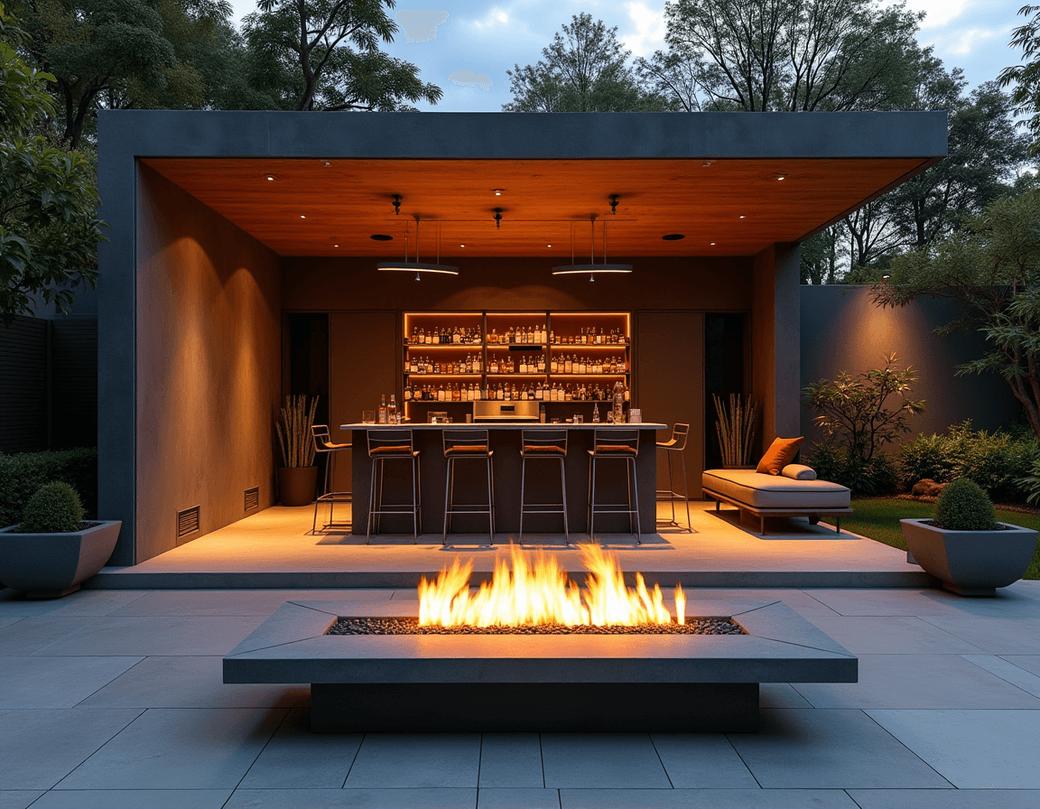 In a large outdoor bar area, a fire pit brings light, movement, and an instant sense of atmosphere. This setup includes a sleek, modern fire pit in front of a full bar equipped with a chaise lounge and fully stocked shelves, creating different spaces for lounging.