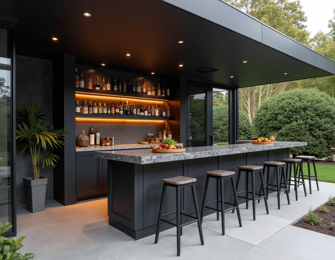 Sleek, matte, and high contrast — black and charcoal finishes instantly signal a modern design. They create clean lines and strong definition, especially when paired with light materials like concrete, wood, and stone. In this modern bar area, the dark finishes frame the space and make the surrounding greenery sing. It’s a creative outdoor bar idea that adds plenty of drama without relying on bold colors or luxe materials.
