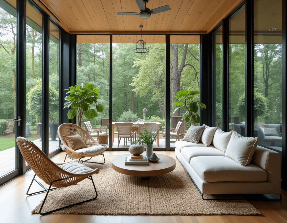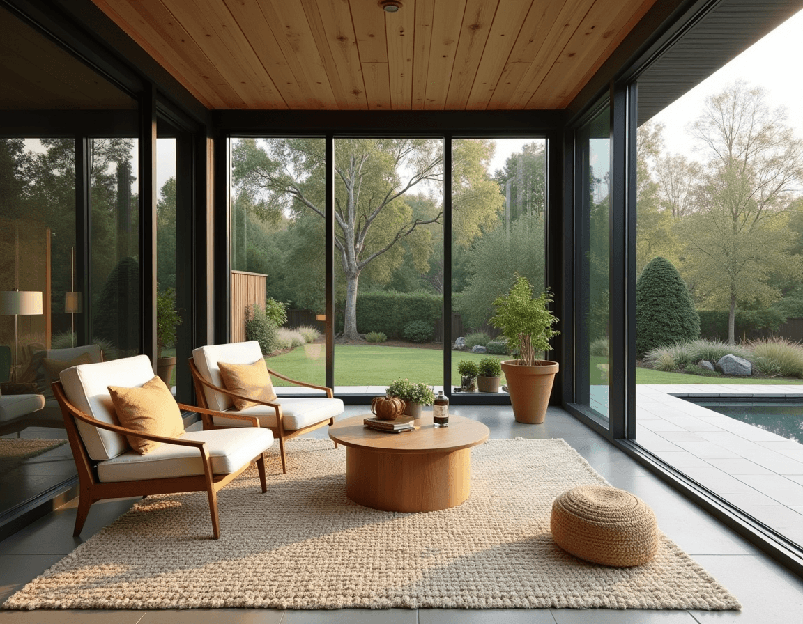 Natural wood may get most of the attention in modern sunrooms — but ceramics deserve a spot, too. With their subtle shine and organic curves, ceramic stools and side tables add earthy charm with a softer, sculptural twist. Here, a pair of ceramic side tables double as ottomans for two retro-inspired accent chairs, breaking up the room’s clean lines and adding just the right touch of contrast.