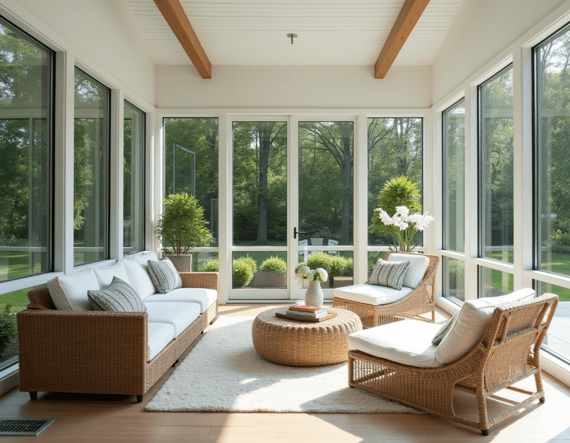 Woven furniture brings an easy, coastal home style to a sunroom. This space mixes rattan chaises, a wicker couch, and a matching coffee table for a look that’s relaxed but refined. White cushions and a bouclé rug soften the texture, keeping the whole setup calm and cohesive.