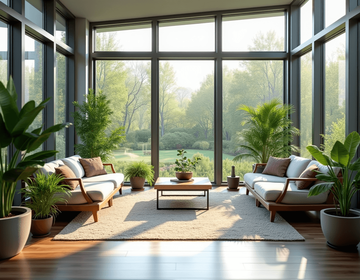 To keep the focus on the foliage inside and out, furniture placement matters. Here, two sofas hug the walls to leave the center open, while tall potted plants tuck into corners without blocking the natural light.