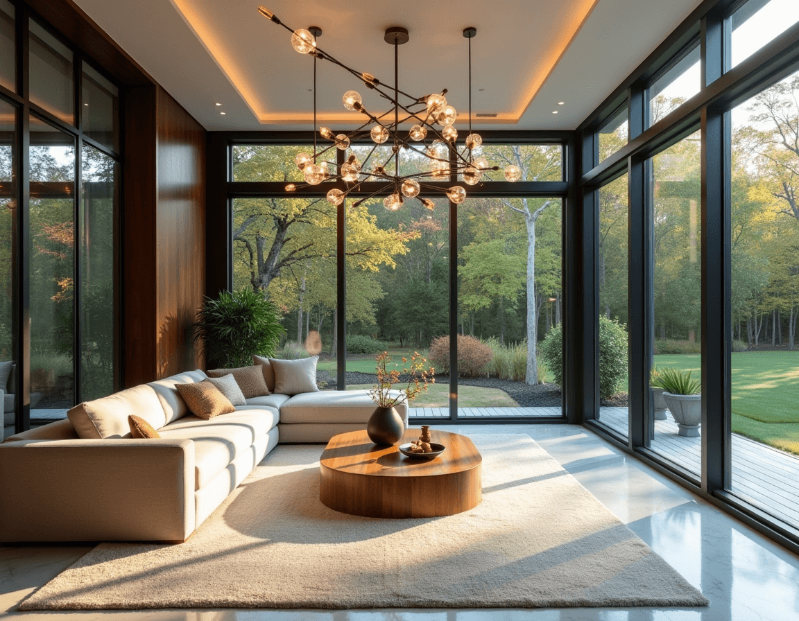 Most sunroom decorating ideas keep things simple — and for good reason. The less you add, the more nature stands out. But here, a maximalist Sputnik pendant lamp breaks the mold, floating above an oval coffee table with rich wood grain. A low, oversized sectional along the wall softens the look, keeping the balance just right. The neutral palette holds everything together, giving the standout shapes room to shine.