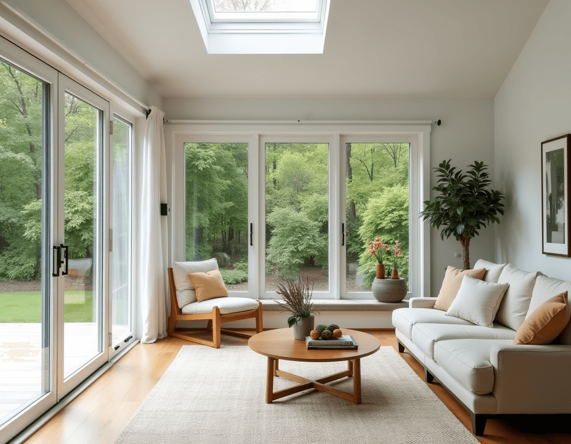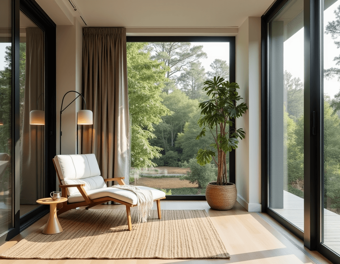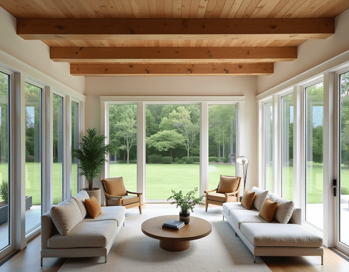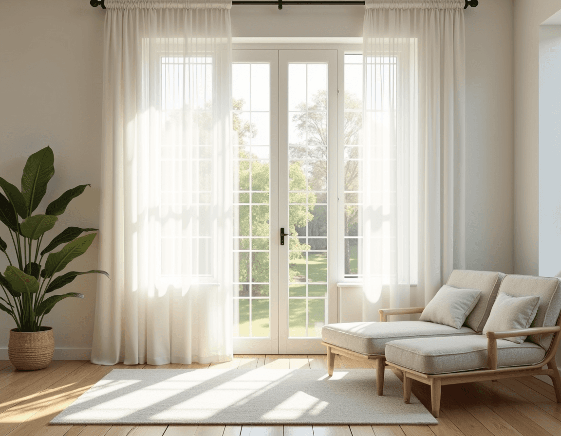 Plenty of natural light is great — unless it turns your cozy room into a midday oven. In this Scandinavian-inspired sunroom, sheer curtains help prevent that. They filter the light just enough to cast a soft, dreamy glow across the pale wood furniture. It’s a gentle and atmospheric touch, perfect for modern, four-season room designs meant to feel bright and comfortable all year long.