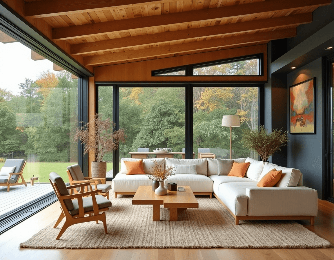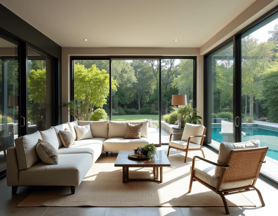 In this sunroom, an oversized L-shaped sectional sofa and a pair of armchairs make the space feel lived-in and welcoming. The pieces are large but chosen with care — their low profiles keep sightlines open so the floor-to-ceiling windows can show off the greenery outside. The room feels full but never crowded — just relaxed and thoughtfully put together.