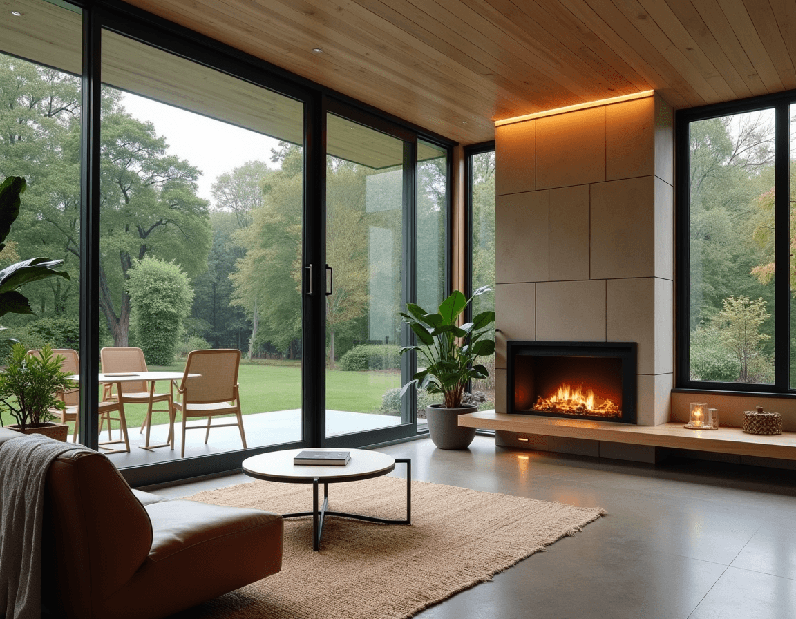 Despite the name, sunrooms aren’t always warm, especially in colder climates. In this one, a modern electric fireplace forms the base of a tiled column, with a built-in bench that just might be the coziest seat in the house. The clean lines and minimalist shape keep the look crisp, adding just enough hygge to soften the cool, Nordic-inspired modern interior design.