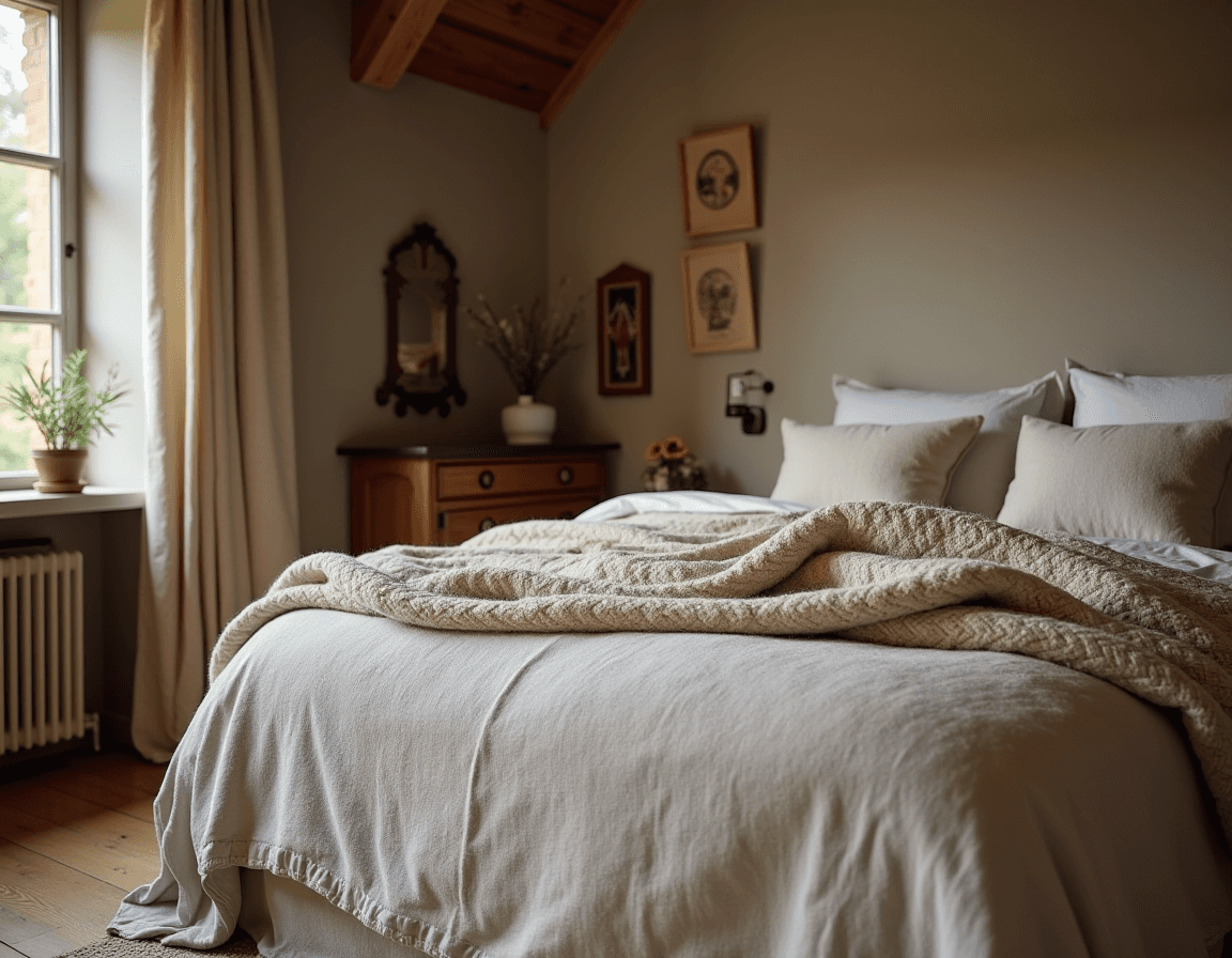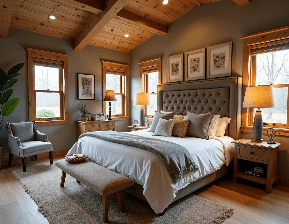 Mix and match blankets and pillows with varied textures and volumes: thick wool throws, rumpled linen duvets, soft cotton sheets, and maybe a sheepskin hung over an accent chair for days that deserve an extra nap. Stick to neutral colors or muted earthy tones, especially if the rest of your decor centers on rich wood details. The result will be a bedroom that looks unfussy but feels like a personal retreat.