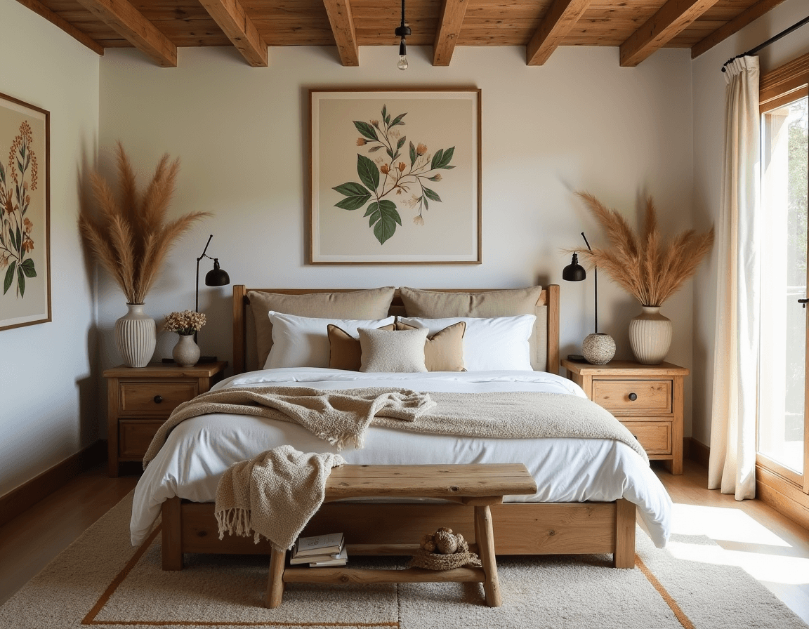 If you don’t have enough light for houseplants or a green thumb, bring the outdoors in with thoughtful artwork and natural materials instead of live plants. Tall pampas grass, branches you won’t have to water, or vintage botanical prints that decorate the nightstand create a gentle connection to nature. Even artificial plants can add grounding details that transform a room from modern to rustic.