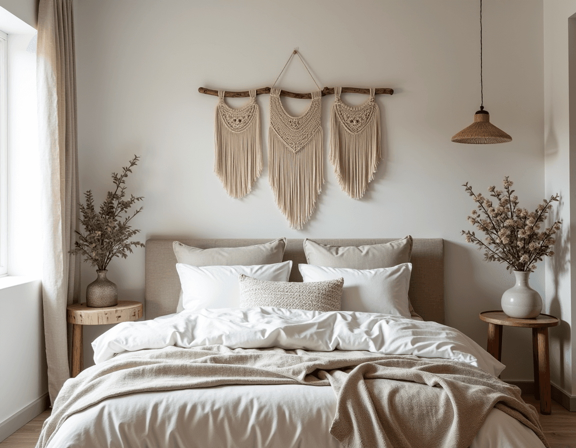 Rustic aesthetics aren’t identical to farmhouse or cabin styles — they can lean a little more bohemian. What ties the interior design styles together is an appreciation for hand-crafted materials. Macramé and other types of woven wall hangings make a modern rustic bedroom feel handpicked just for you.