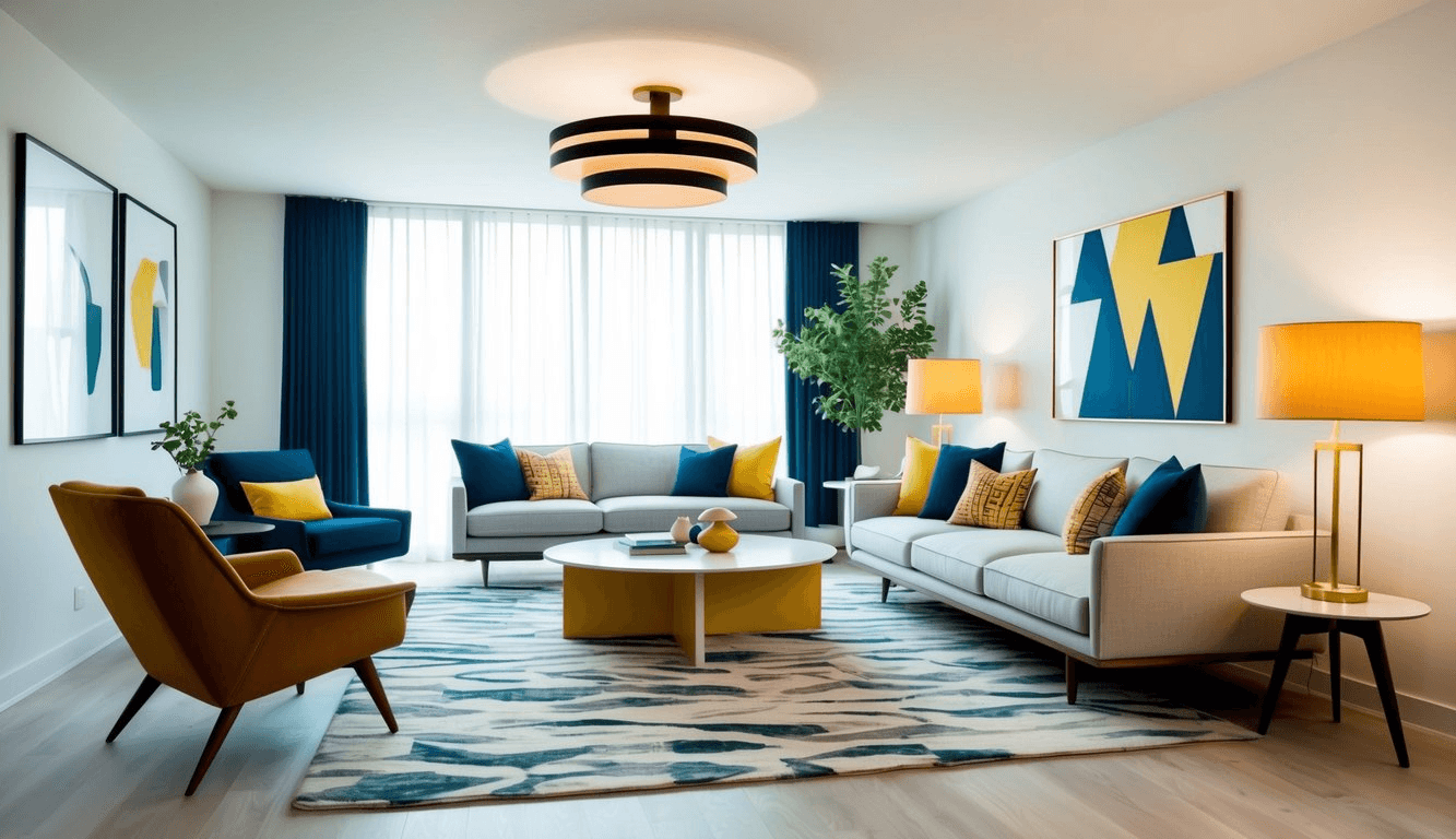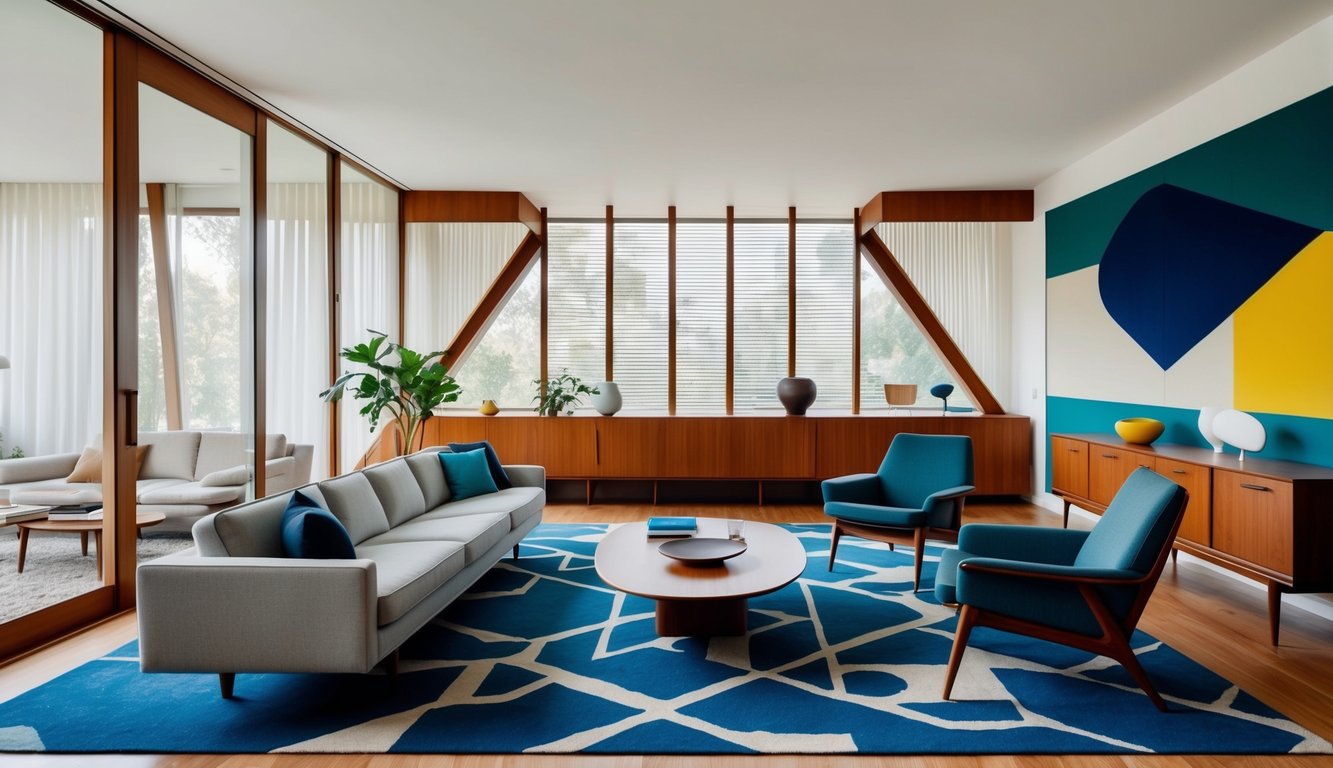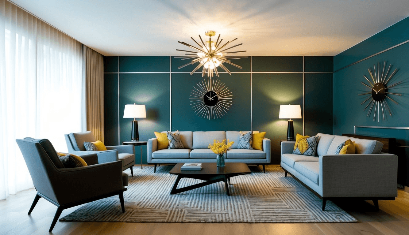 You can incorporate this aesthetic through iconic pieces like Eames chairs, sunburst mirrors, or walnut sideboards.