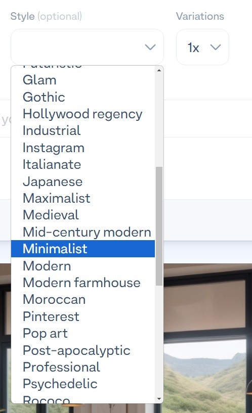 Step 2: Select Design Preferences Choose your preferred design style from a wide range of options, such as Bohemian, Cyberpunk, or Coastal. You can also use prompts to describe the features you want.